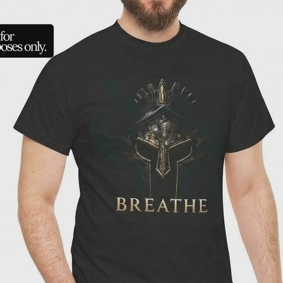 Printed beneath the armored visage is the word “BREATHE” — a reminder to remain still and focused in chaos. This tee is ideal for stoic thinkers, modern-day warriors, or anyone who believes that true power begins within. Whether you’re navigating daily battles or moments of reflection, wear this shirt as your armor of presence.