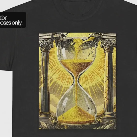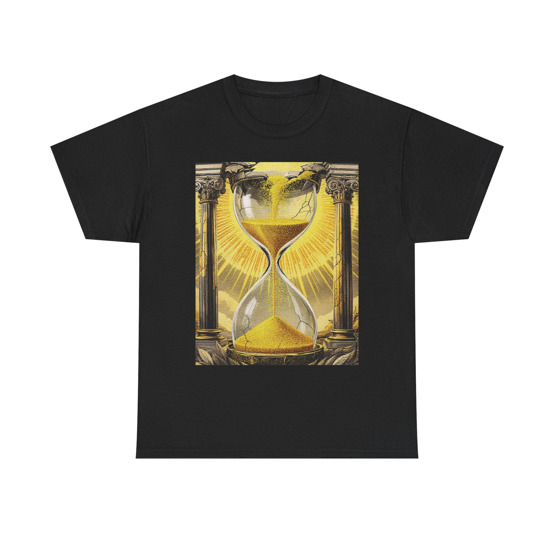 Embrace the passage of time with the Eternal Sands T-Shirt — a visual masterpiece that captures the fleeting beauty of every moment. Featuring a radiant hourglass set between two ancient pillars and framed by a golden sunburst, this design speaks to those who live with purpose and perspective.