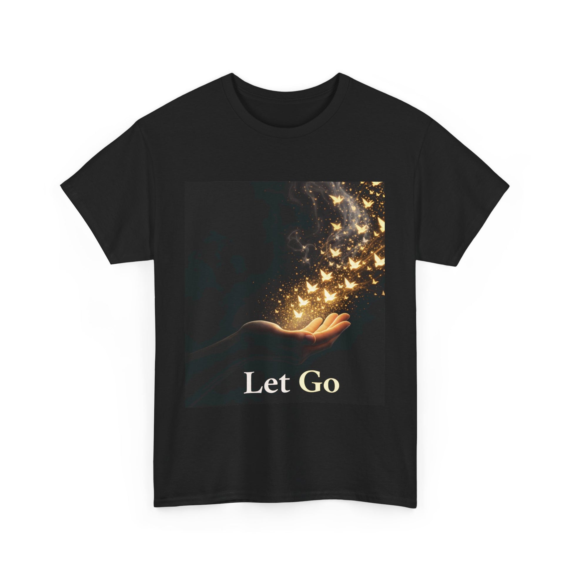Release what no longer serves you in the Let Go T-Shirt, a striking visual expression of peace, surrender, and transformation. The artwork features an open hand releasing golden butterflies into the air, glowing like sparks of light — a reminder that letting go can be an act of strength and clarity.