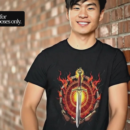 Unleash the fire within. The Sword of the Inner Flame T-Shirt channels ancient energy with modern edge, featuring a blazing sword suspended in a circle of fire and stone. At the center, glowing rings pulse like a warrior’s heartbeat, radiating strength, clarity, and intention.